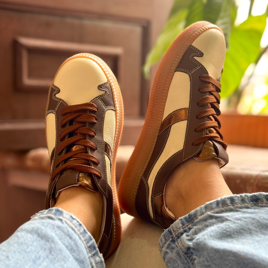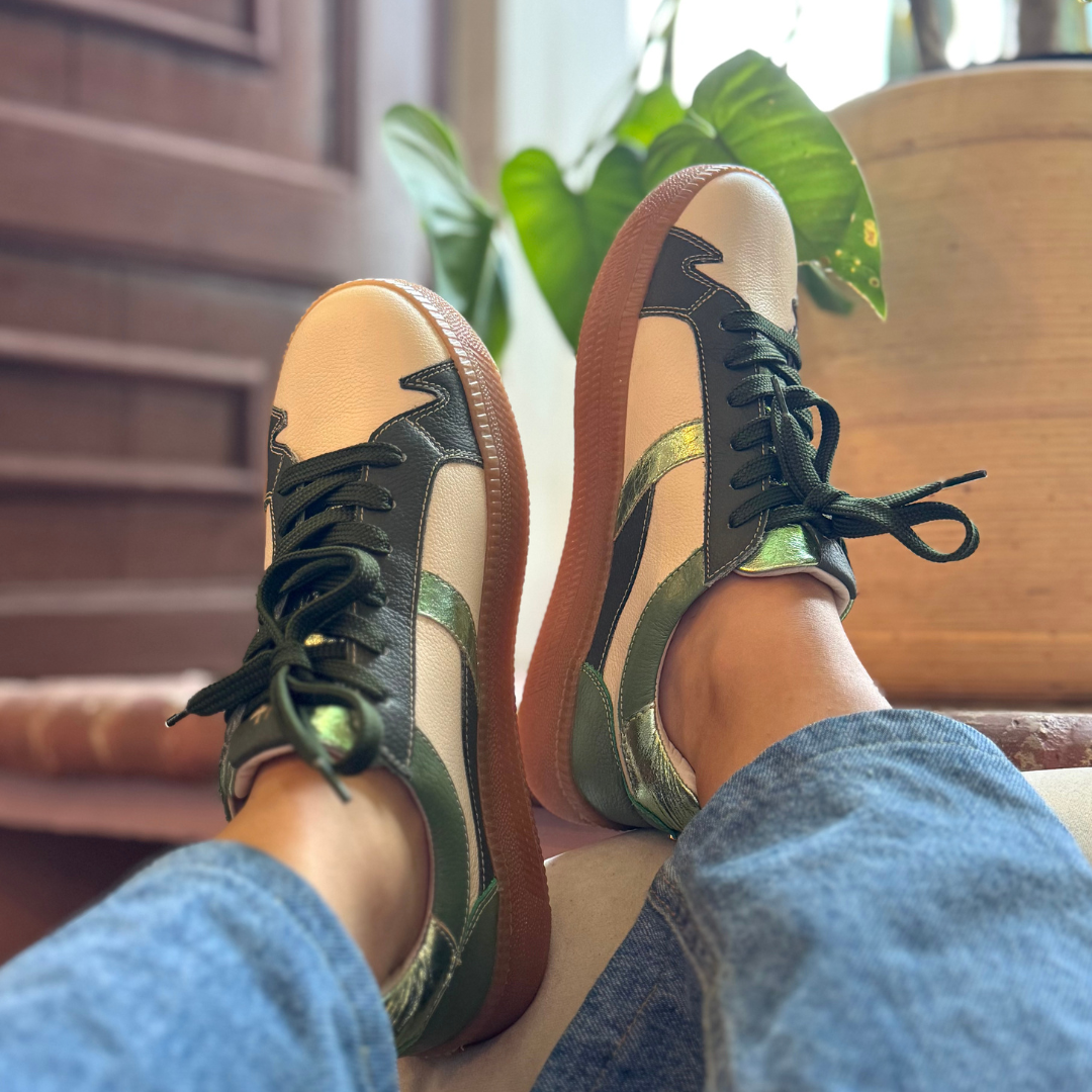 This design captures Athenara’s freshest spirit: artisanal, versatile, and filled with an energy that combines nature, strength, and well being. Its mix of natural tones with metallic accents makes it modern yet timeless. Sneakers that elevate your style and accompany every step with authenticity.