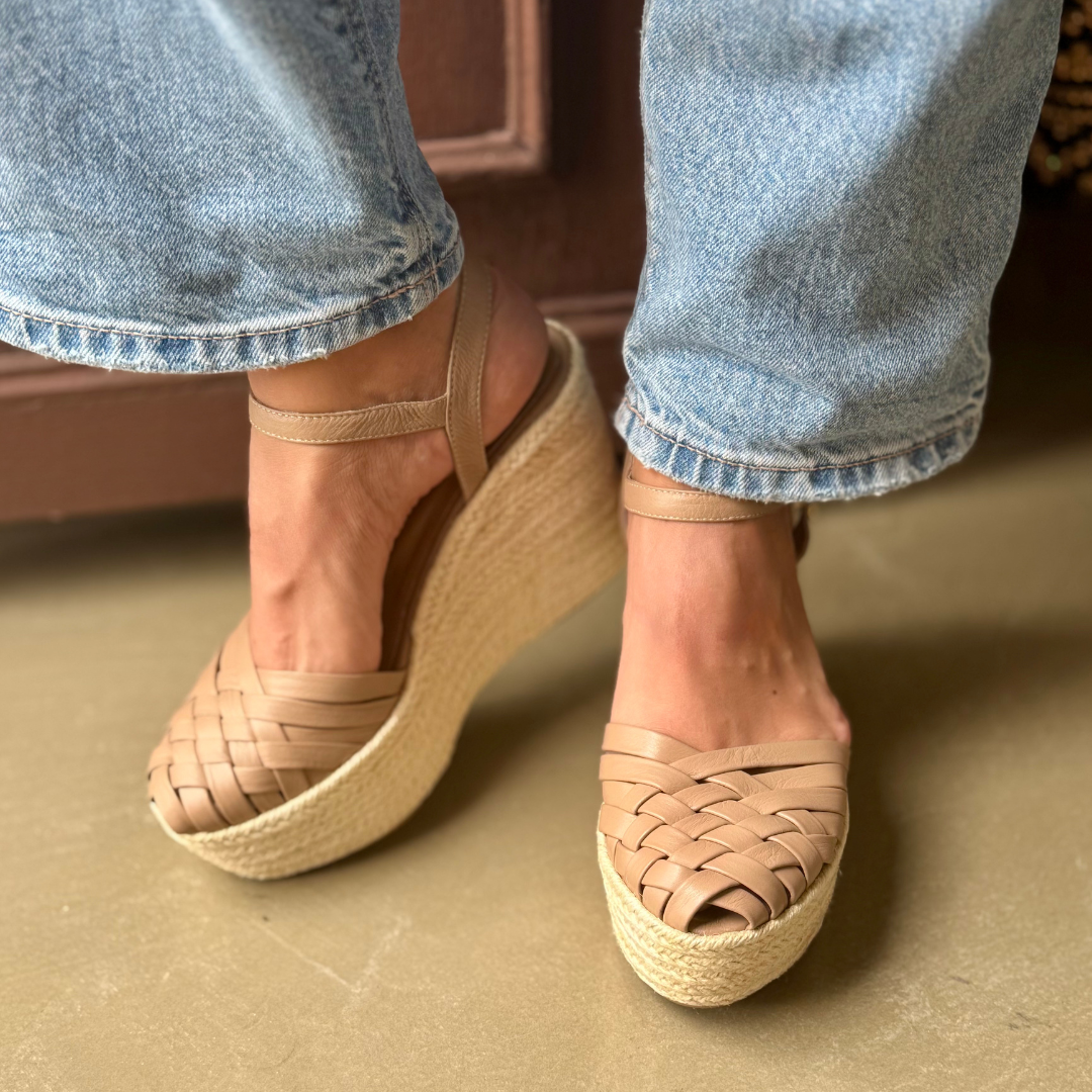 Gretta weaves artisanal heritage into a modern silhouette, with soft leather strips that form a timeless, feminine design. Its espadrille wedge adds height with natural ease, while the adjustable strap provides comfort and stability. A pair that elevates every step with craftsmanship, elegance, and effortless charm.